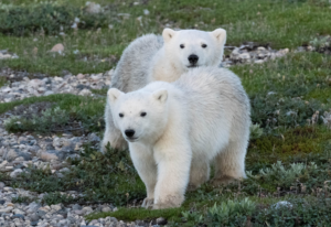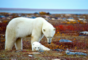 This bit of cold didn’t stop the yearlings from taking notes from their mother as they practiced the skills needed to survive the bitter cold and provide for themselves. The mother bear keeps her cubs in excellent condition as she mentors them, their clean white fur standing out in striking contrast against the fall colors. Curious and confident, the family approached several Polar Rovers and seemed comfortable with our presence, even nursing just off the trail.