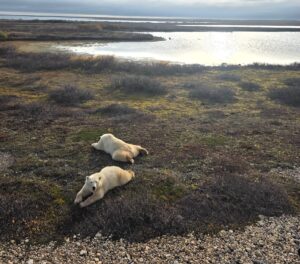 Heading east in the Polar Rovers, we stopped at a spot that’s become a favorite hangout for the bears, as they’ve been seen there several days in a row. Our familiar mother bear and her two cubs of the year were spotted near the coast of Hudson Bay, where kelp seemed to be the most popular item on the menu. The trio spent the morning sampling the salty strands washed up along the shore before crossing the trail and bedding down beside a pond, where they rested for the afternoon. Not far away, three solo bears around Gordon Point were also making the most of the calm weather—taking in the sunshine and letting the golden rays illuminate their white fur.