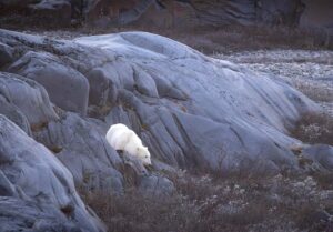 Farther to the west, another lone bear was more active. This bear appeared smaller and younger, and he spent most of the day chewing on remains from a caribou carcass, eventually going for a swim in Hudson Bay, where he unsuccessfully pursued a seal. Although no live caribou were seen today, there were fresh tracks in the area.