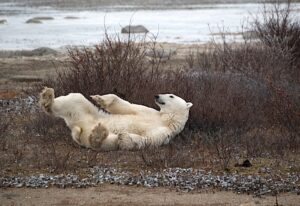 Solo bears were seen throughout the WMA today, as well as the family groups. These solo bears primarily spent their time resting, conserving their energy for the remainder of their time on land before the sea ice forms again. One bear, however, decided to put on a show by rolling around in some interesting positions before walking into a nearby pond, where it promptly plunked itself down and rested in the cool water for nearly half an hour before leaving to find a dry spot.