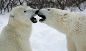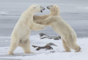 Wildlife sightings were scattered yet memorable. Near the Tundra Lodge, two large males bears drew our attention as they sparred in the snow with notable grace. A mother and cub meandered across the flats nearby. Another bear swam along the edge of the bay, its dark shape gliding through pale water beneath the gray sky—a quiet display of resilience in these shifting conditions.