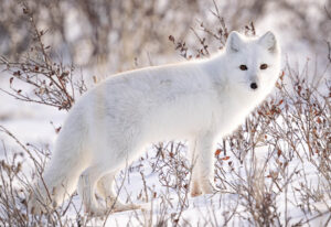 Closer to town, the morning began with a flash of color—a cross fox trotting near the old Navy Base, its dark coat glowing against the snow. A snowy owl perched stoically on the rocks by the marine observatory, watching the wind shift over the Bay. Around town, two Arctic hares bounded through the willows, their new white coats bright against the muted browns of late autumn. One group traveling between town and the CWMA reported a banner day: seven polar bears in total—five seen from a distance, and two close roadside bears that paused long enough for guests to savor the moment—plus a red fox and three more Arctic hares along the way.