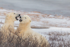 Winter is settling in quickly across the Churchill region. The Churchill River froze over at high tide, with ice continuing to build along the coast. Temperatures stayed below freezing and, though skies were mostly cloudy, occasional snow squalls swept through the area. The shifting weather created a dramatic backdrop for another day full of polar bear activity and lively tundra scenes.